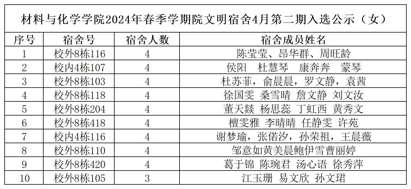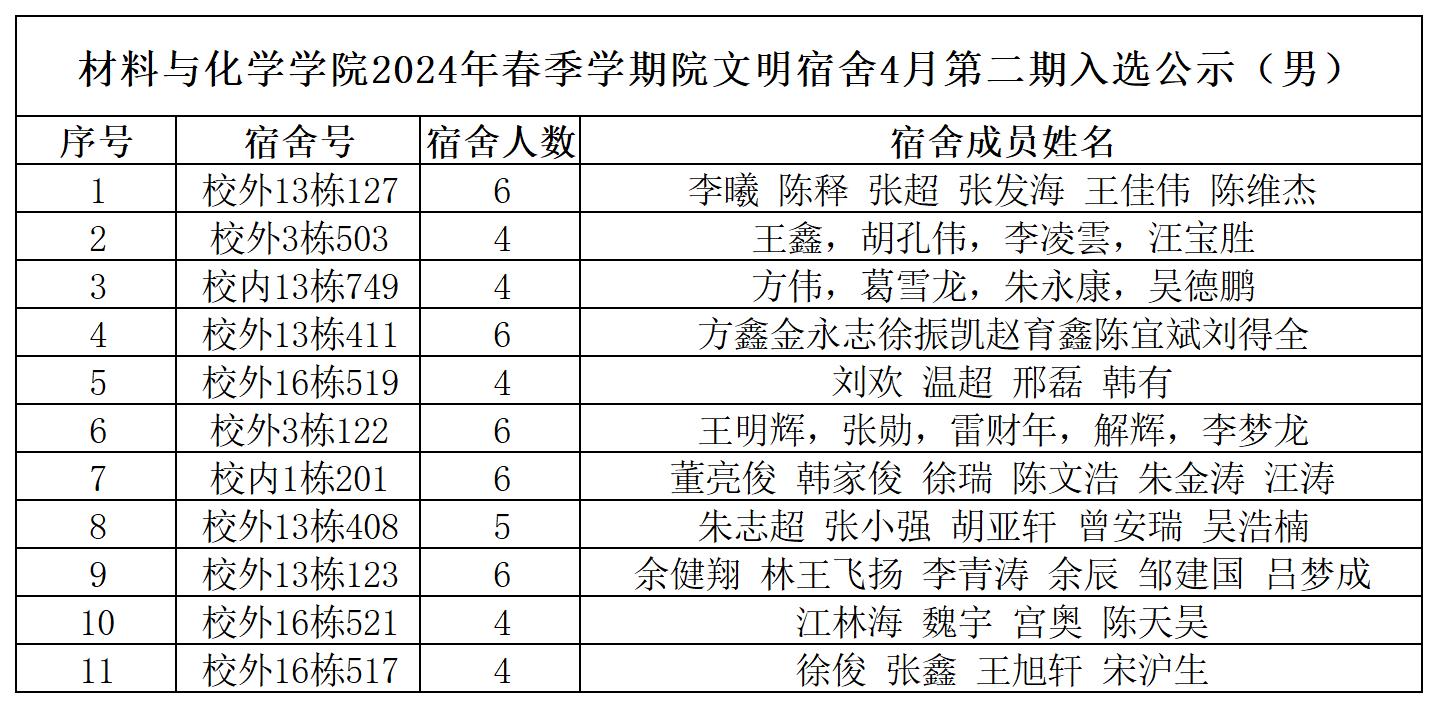 材料与化学学院2024年4月份第二期院文明宿舍的公示