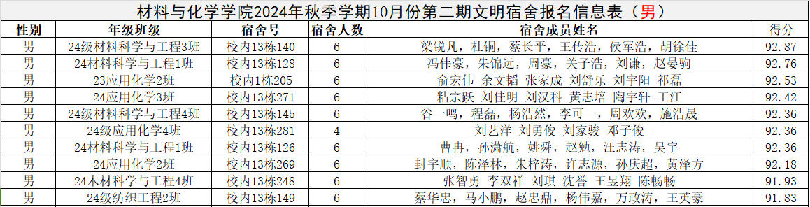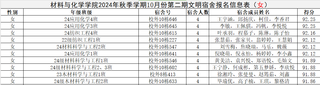 材料与化学学院2024年10月份第二期院文明宿舍的公示