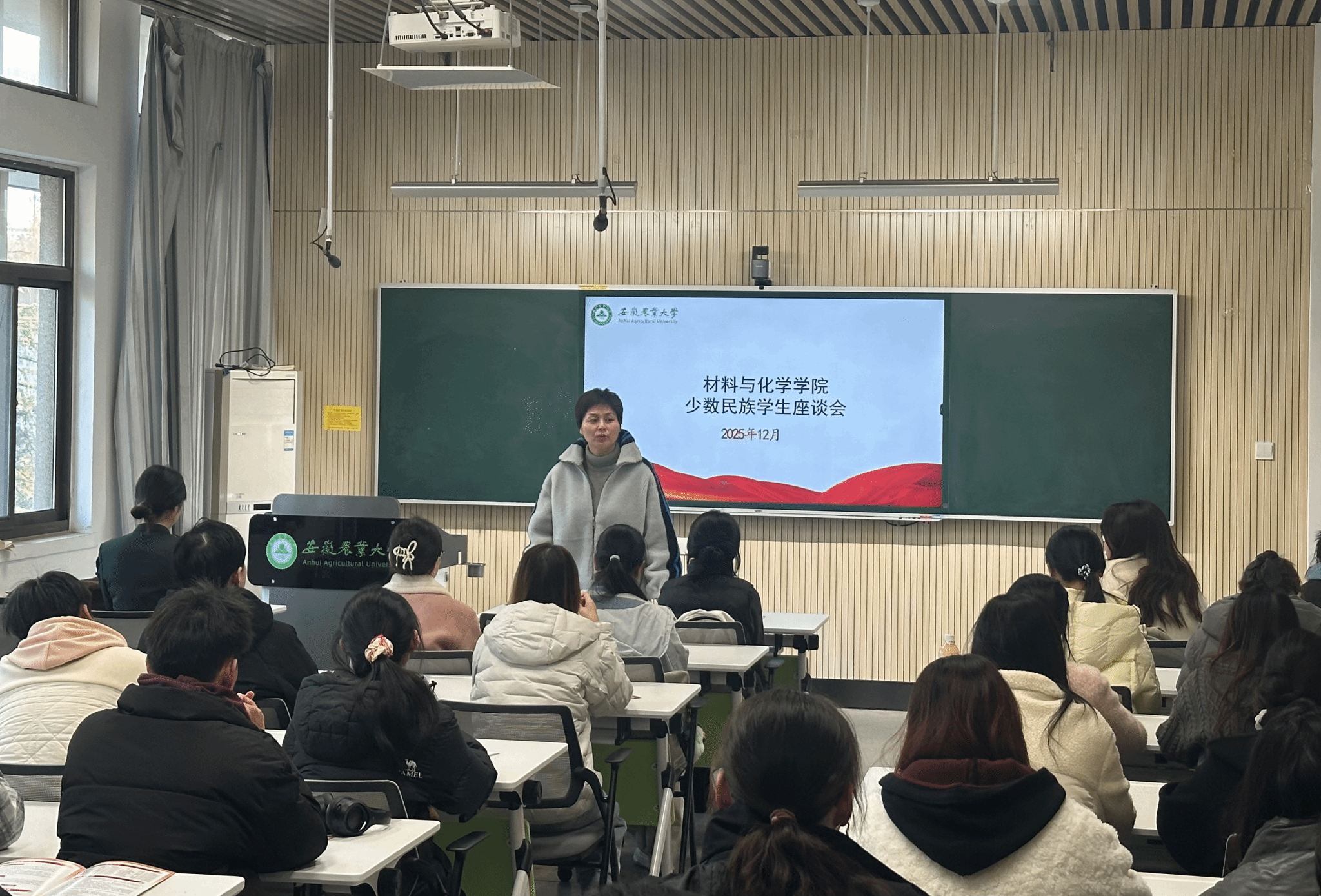 本网讯 为进一步关心关爱少数民族学生成长发展,筑牢校园民族团结根基,12月9日,材料与化学学院组织召开少数民族学生座谈会。学院党委副书记周晓娟、辅导员及各年级少数民族学生代表齐聚一堂,围绕学业发展、校园生活、文化融入等话题展开深入交流。