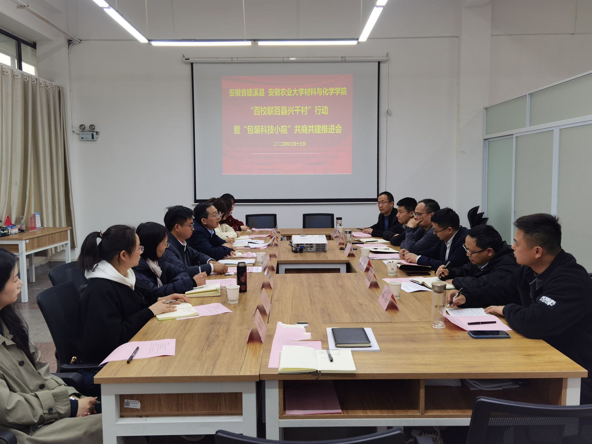 本网讯 3月13日,绩溪县与材料与化学学院在学院3A09会议室联合召开“百校联百县兴千村”交流座谈会暨“包装科技小院”共商共建推进会举行,绩溪县委组织部副部长、县委编办主任高斌、共青团绩溪县委、绩溪县乡村振兴局、绩溪县荆州乡等单位负责同志参加会议,材料与化学学院党委书记夏成云、院党委副书记、纪委书记周晓娟以及学院部分教师参加会议,会议由院党委副书记、院长汪钟凯主持。
