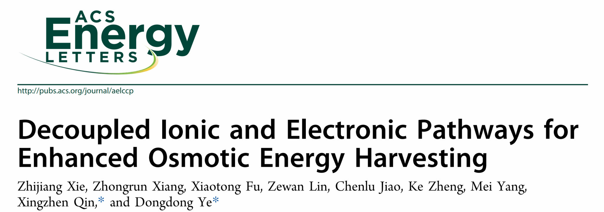 本网讯 近日,我校材料与化学学院生物质基可持续材料课题组叶冬冬教授团队在《ACS Energy Letters》(中科院一区topIF=22.0)发表纤维素相关最新研究论文,题目为“Decoupled Ionic and Electronic Pathways for Enhanced Osmotic Energy Harvesting”,美国化学会以This salt battery harvests osmotic energy where the river meets the sea为题对本项目进行专门报道,充分肯定了项目创新性,这是该团队今年发表的第5篇中科院一区top论文。
