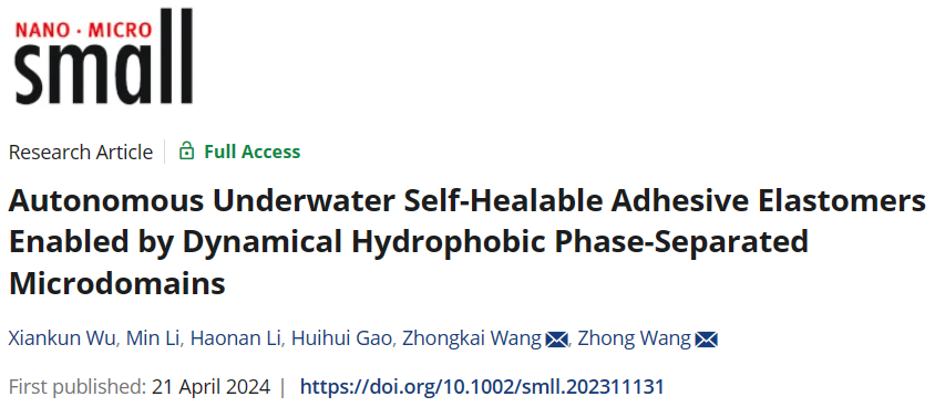 本网讯 近日,我校汪钟凯教授团队在植物油基高性能弹性体领域取得研究进展,相关成果以“Autonomous Underwater Self-Healable Adhesive Elastomers Enabled by Dynamical Hydrophobic Phase-Separated Microdomains”为题发表在Wiley期刊《Small》(中科院一区TOP,IF=13.3)。