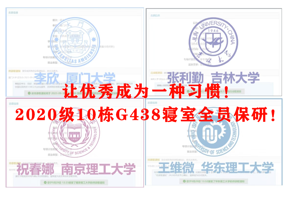 本网讯:在安徽农业大学材料与化学学院,有这样一个寝室,他们是彼此的“学习搭子”,他们志同道合,4人学分绩点均3.9+,1人获国家奖学金,3人获国家励志奖学金,4人共获得12次校级奖学金,累计获得50000元奖学金,连续三年均获得校级“三好学生”荣誉称号,13项国省级科研竞赛奖项,分别获得厦门大学、吉林大学、南京理工大学、华东理工大学,研究生录取offer,她们是安徽农业大学材料与化学学院,本科2020级10栋G438寝室女生——李欣,张利勤,祝春娜,王维微,风雨兼程,四人携手共进,在奋斗中书写璀璨青春。