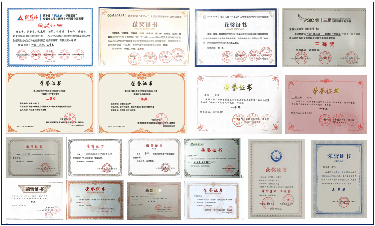 前三学年平均学分绩点4.10,平均成绩91.15,多门专业课程成绩95+,曾获得两次国家励志奖学金,安徽农业大学特等奖学金,安徽农业大学二等奖学金,校级“三好学生”,“优秀团干部”、“优秀共青团员”等多项荣誉。先后获得第二届全国大学生电化学测量技术竞赛二等奖,第三届全国大学生化学实验创新设计大赛华中赛区三等奖,第十三届安徽省科普创意创新大赛三等奖,第三届安徽省大学生化学竞赛二等奖,第四届上海市暨首届长三角大学生实验室安全知识竞赛三等奖,安徽农业大学化学竞赛一等奖等竞赛奖项。
