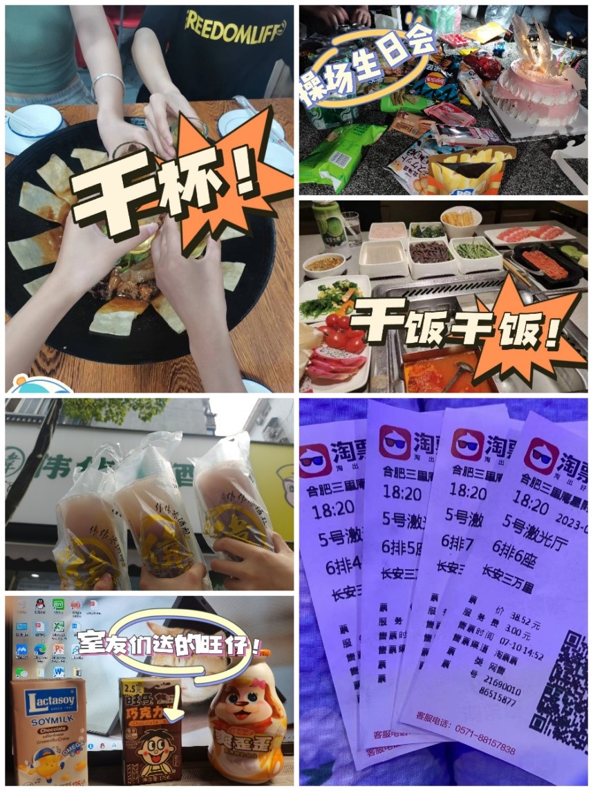 她们不仅是学习上志同道合的“学习搭子”,更是生活中彼此照顾的挚友。李欣作为寝室长,心思细腻,总会给在寝室常备感冒药,以备不时之需。她们互相关心、彼此牵挂,三年来总是为过生日的小伙伴准备惊喜,满满的“仪式感”。高强度的学习难免会疲劳,她们也有自己的放松之法。张利勤喜欢运动,摄影,所以四人总会相约去球场打羽毛球,从而缓解学习压力。李欣喜欢跳舞,享受在汗水中释放压力的感觉。王维微喜欢音乐,她们也会在某个闲适的周六,在操场上听听飞扬音乐社带来的歌曲,聊聊最近的学习与生活。节假日,她们也会一起出门,逛街、吃饭、玩游戏。不必惊讶于四人的爱好如此相似,是因为他们都愿意为了彼此去尝试新鲜的事。就像祝春娜所言:“真正能让我们放松的并不是某项娱乐活动,而是我们能够在一起做同一件事。”从陌生到亲密,再到互相帮助,回头看,她们陪伴彼此已走过了很远的路。
