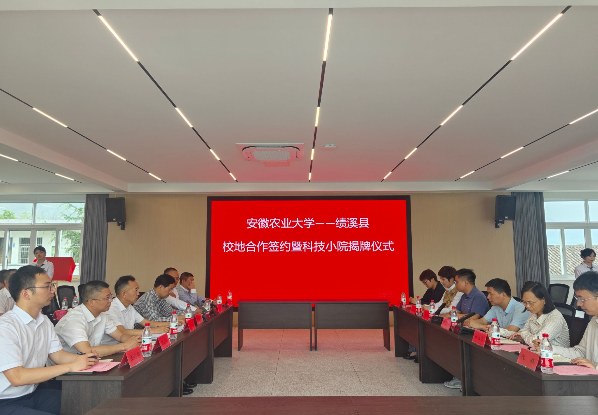 本网讯 5月30日上午,学院与绩溪县校地合作签约暨科技小院揭牌仪式在伏岭镇小镇客厅会议室隆重举行。绩溪县委副书记邱型军,县人民政府副县长汪全胜、学院党委副书记、院长汪钟凯、校社会合作处副处长张志平、以及学院和绩溪县相关部门负责同志、企业负责人参加了签约和揭牌仪式。