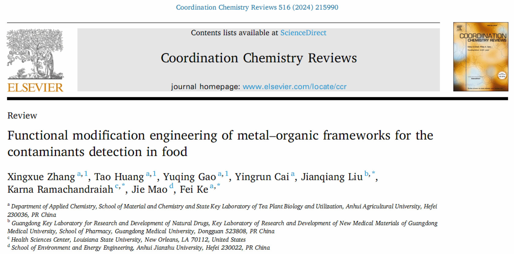 本网讯 近日,我校材料与化学学院柯飞教授团队在国际权威学术期刊《Coordination Chemistry Reviews》(IF=20.6,中科院一区TOP)发表题为“Functional modification engineering of metal-organic frameworks for the contaminants detection in food”的综述论文。