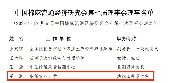 团队负责人刘从九教授多年来作为棉花领域资深专家,积极参与棉花加工与检验等领域标准研制和标委会工作。2024年12月,刘从九和王浩获批成为第四届全国棉花加工标准化技术委员会顾问和中国棉麻流通经济研究会第七届理事会理事。团队成员积极参与该领域标准的制定与相关项目研究工作,增强学校纺织学科及其专业在棉花加工与流通领域的话语权和影响力,助力我校农工商融合发展的特色高水平大学建设。