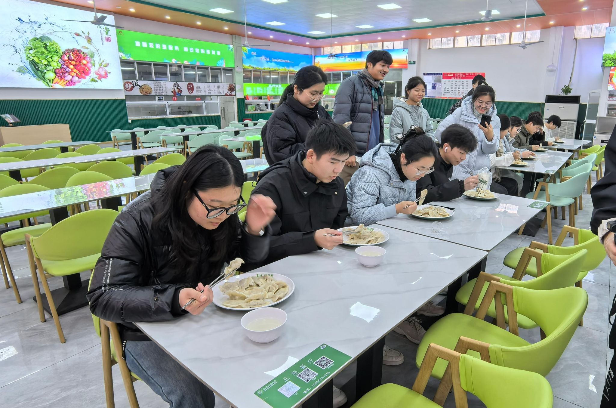活动现场,同学们围坐一起,面皮裹着馅料在他们手中巧妙捏出形态各异的饺子,不仅有传统的半月饺子、麦穗饺子、元宝饺子,还有“太阳神饺”“笼包饺”“安农梅花饺”等创意饺子纷纷亮相,令人目不暇接。在食堂工作人员的帮助下,包好的饺子接连下锅。待饺子煮好之后,每组派出两名同学参加大胃王比赛,其余同学们情绪高涨地为出战同学加油助威,活动现场气氛热烈。另一部分饺子由同学们送到了食堂工作人员手中,与他们共同分享温暖与温馨,让冬日里的温情传递到更多人手中。