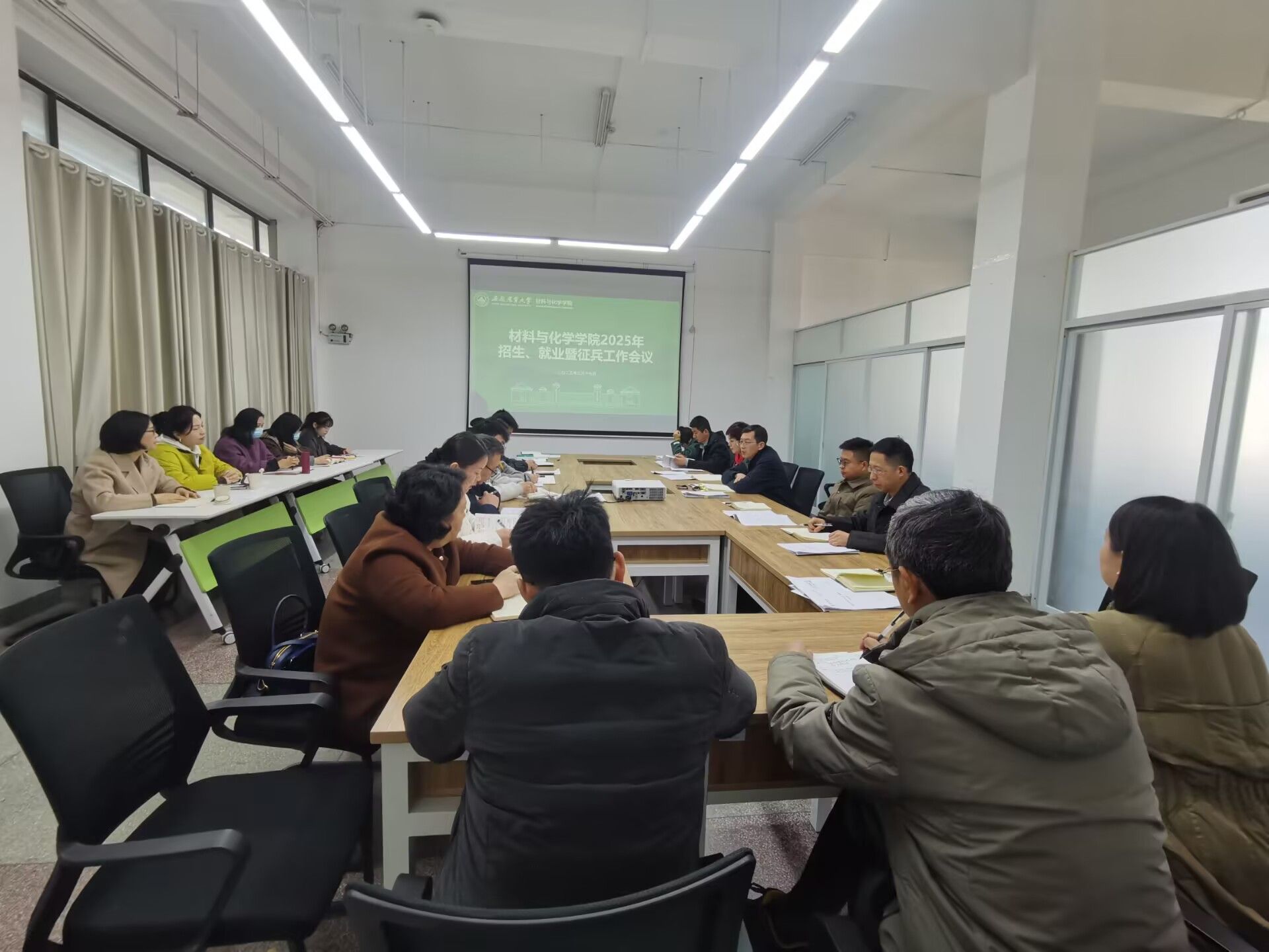 本网讯 3月17日上午,材料与化学学院在材化楼402会议室召开2025年招生、就业暨征兵工作会议,全面部署新形势下学院招生宣传、毕业生就业及大学生征兵工作。学院领导班子成员、党委委员、支部书记、系主任、毕业班辅导员、相关工作联络员参加会议,会议由学院党委副书记、纪委书记周晓娟主持。