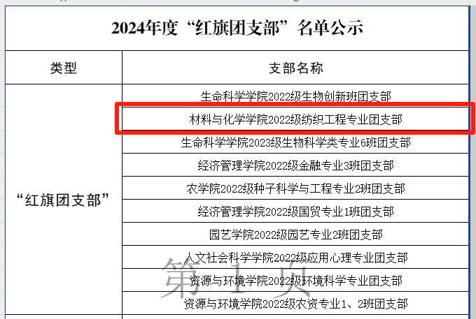 近日,2024年度校级“红旗团支部”评选结果揭晓。经过团支部申请、学院初评、学院推荐的基础上,经公开答辩,全校共有10个团支部获评该项荣誉。我院2022级纺织工程团支部成功斩获2024年度“红旗团支部”称号,彰显了其卓越的整体风貌。该支部曾于2024年10月获评“校十佳班级”,此次再添新荣誉。