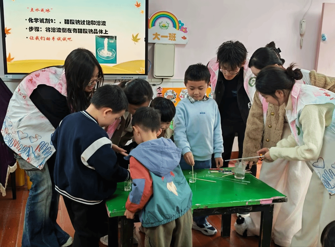 活动中,志愿者们首先为小朋友们演示了“点水成冰”的实验。在一双双充满好奇的眼睛注视下,一杯看似普通的清水,在接触到特定“触发剂”的瞬间,迅速凝结成冰。孩子们惊叹不已,纷纷伸出小手触摸这份“热冰”,感受着它独特的温度与质感。随后,志愿者们用浅显易懂的语言为孩子们解释了实验背后的原理——“点水成冰”其实是过饱和溶液在受到扰动或引入晶核时迅速结晶的自然现象。孩子们在互动中不仅见证了科学的魅力,更在轻松愉悦的氛围中埋下了探索的种子。