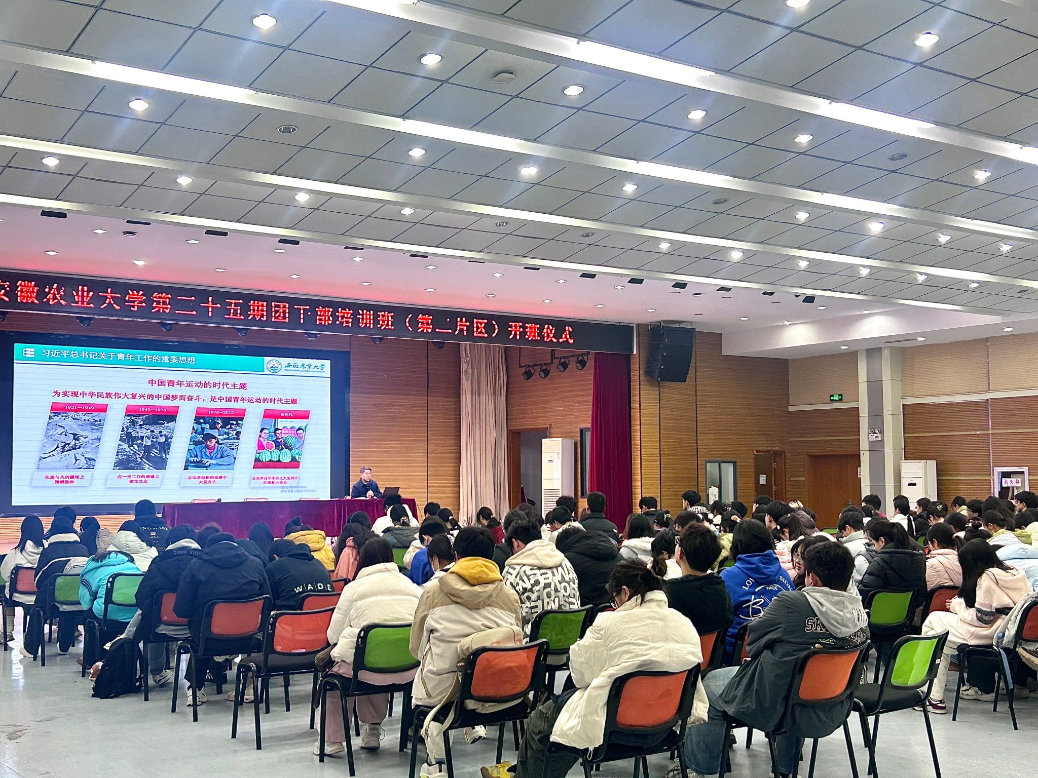 本网讯 为加强团干部队伍建设,提升新生团支部委员的政治素养与工作能力,2025年12月16日,第三十五期团干部培训班第二片区开班仪式暨“从严治团”模块学习在欣苑四楼小礼堂顺利举办。本次活动由材料与化学学院牵头,动物科技学院、动物医学院、茶业学院、食品与营养学院协同组织,第二片区各学院2025级新生团支部委员共计217人参与。
