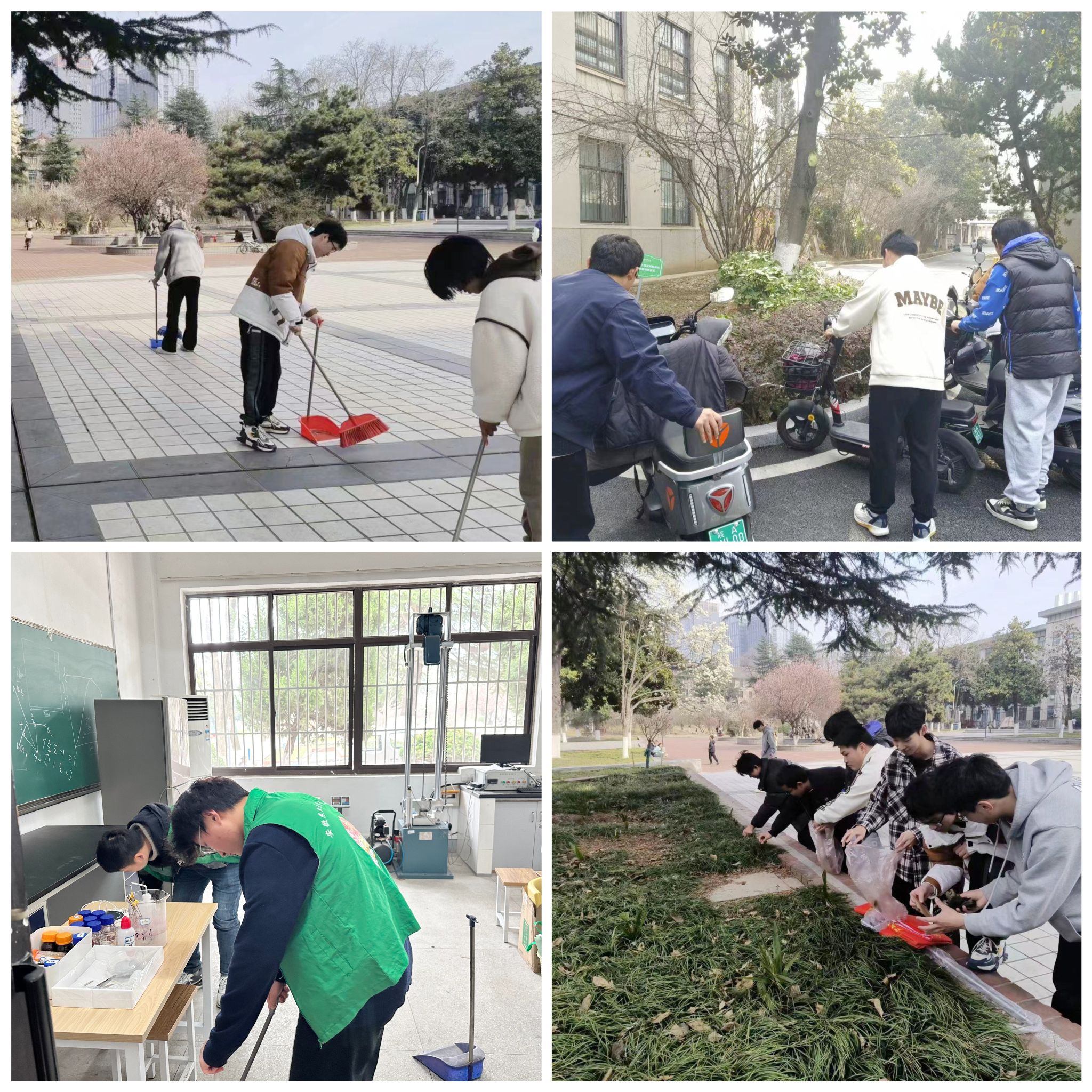 开展校园清扫行,共建美丽校园景。材化院的志愿者们以校园环境建设为抓手,分别前往材化楼前坪广场、实验室等场所进行全方位清扫,将花坛、道路两旁的杂草以及干枯树枝清理干净,将停车处的电动车、自行车摆放整齐,营造了整洁美丽、舒适优良的校园环境。