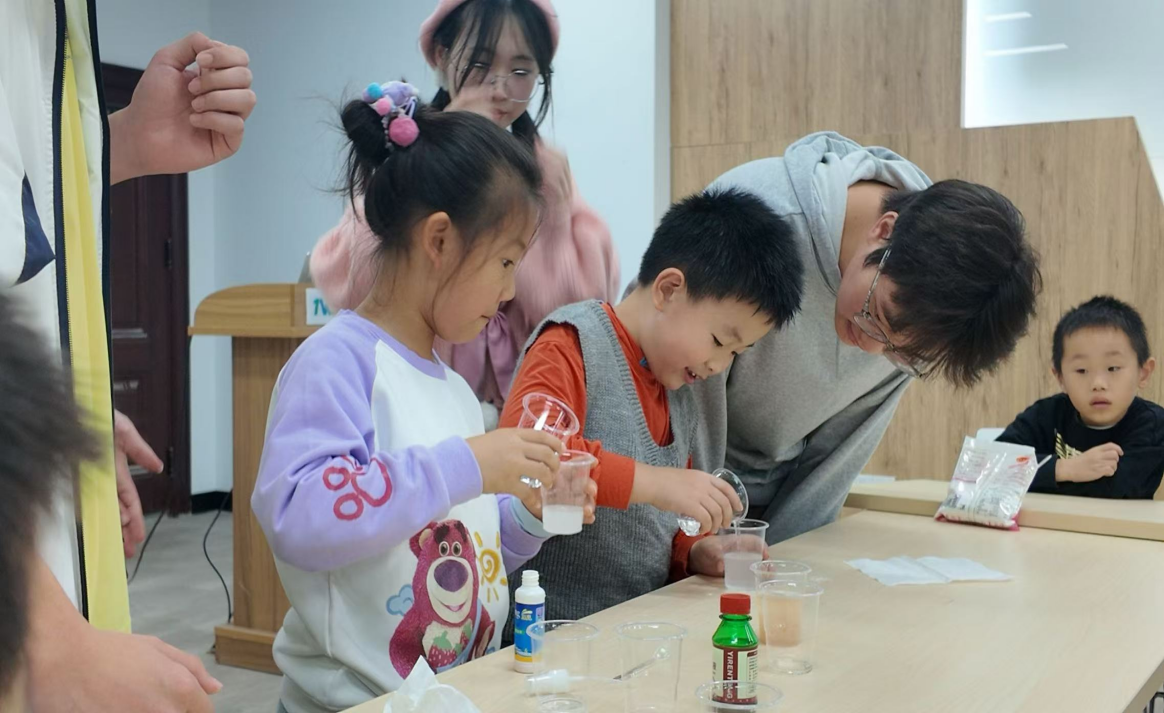 材料与化学学院的志愿者逐一解释了“彩虹雨”和“维生素C检测”两项实验的科学原理。现场小朋友们个个摩拳擦掌,跃跃欲试。志愿者邀请了多位小朋友到讲台前动手操作,培养他们独立动手实验和思考的能力,引导小朋友在亲身体验中感受科学的神奇与魅力。