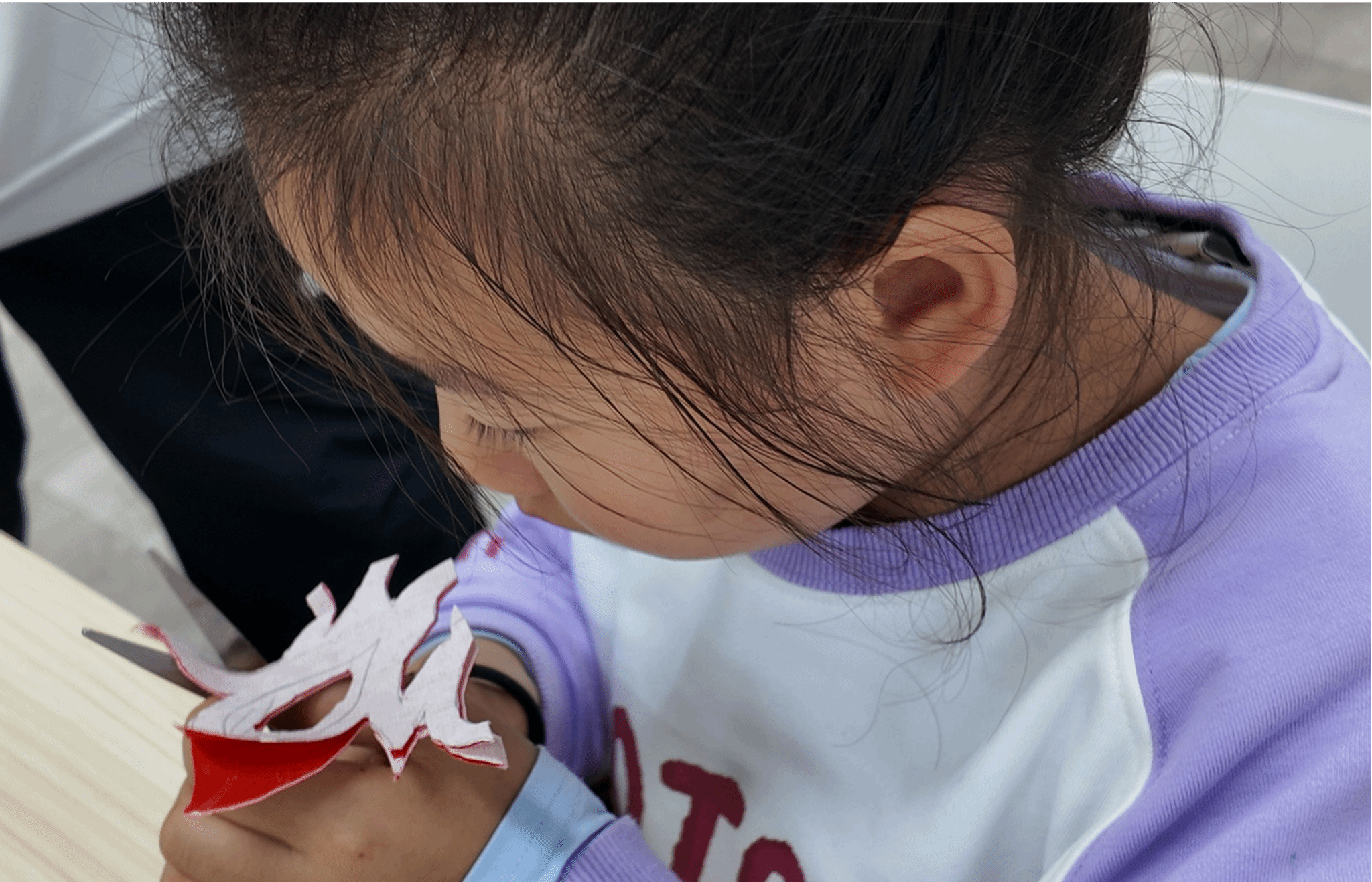 科普实验结束后,志愿者们又带领小朋友们开展了趣味剪纸活动,志愿者郭泰介绍了剪纸的悠久历史与深刻内涵,让小朋友们对剪纸这一传统艺术形式有了初步的了解。随后,郭泰展示了不同种类的剪纸艺术作品,精美的图案、生动的形象,立刻吸引了小朋友们的目光,激发了他们的学习兴趣。