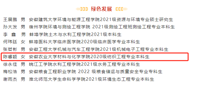 近日,由团省委、省委宣传部、省文明办、省教育厅、省学联等单位联合开展的2023年安徽省“‘十佳’‘百优’大学生”选树工作结果公布,我院2020级纺织工程专业本科生陈睿颖获得安徽省“百优大学生”绿色发展类别的“十佳百优”大学生荣誉称号。