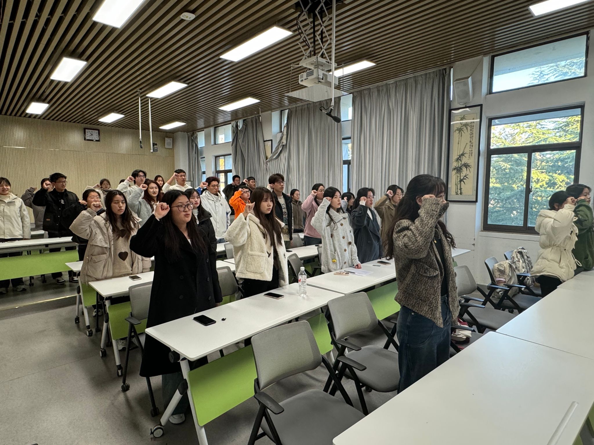 仪式在庄严的团歌声中拉开序幕,全体与会人员神情严肃、精神饱满,以嘹亮的声音共唱团歌。奏唱完毕,余成运宣读本期新入团团员名单并为他们佩戴团徽,由团学骨干蔡东巧同学带领全体团员进行宣誓。