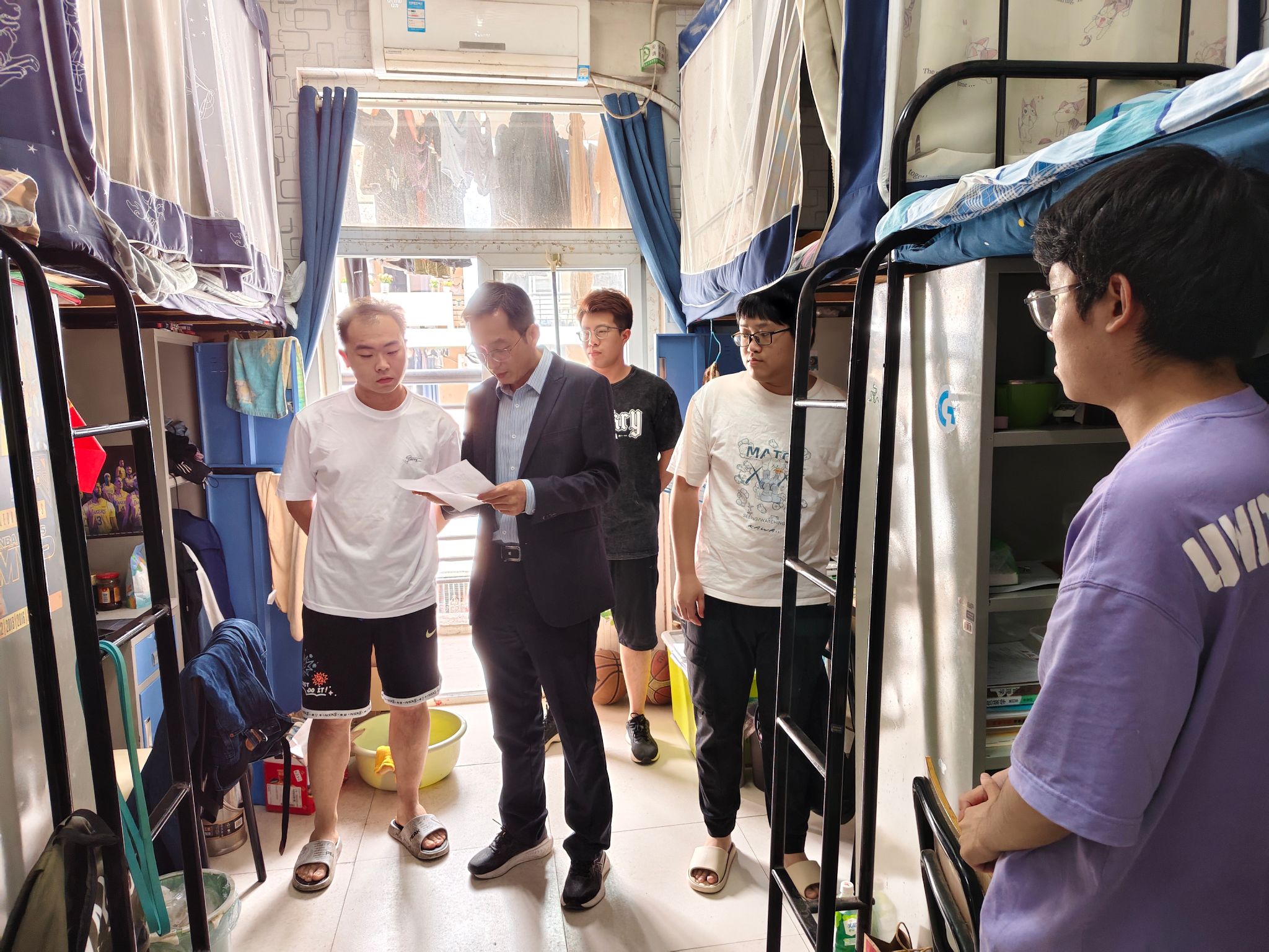树新风,开展“一次寝室走访”。6月18日,为深入了解毕业生在离校时的所需所求,学院领导班子深入学生宿舍看望慰问毕业生,为即将踏上人生新征途的毕业生送去真切的关怀和温暖的祝福,教育引导学生开展宿舍文明清扫行动,树立毕业生文明离校新风尚。(图/代锐 文/编辑/何俊 预审/张续 审核/周晓娟)