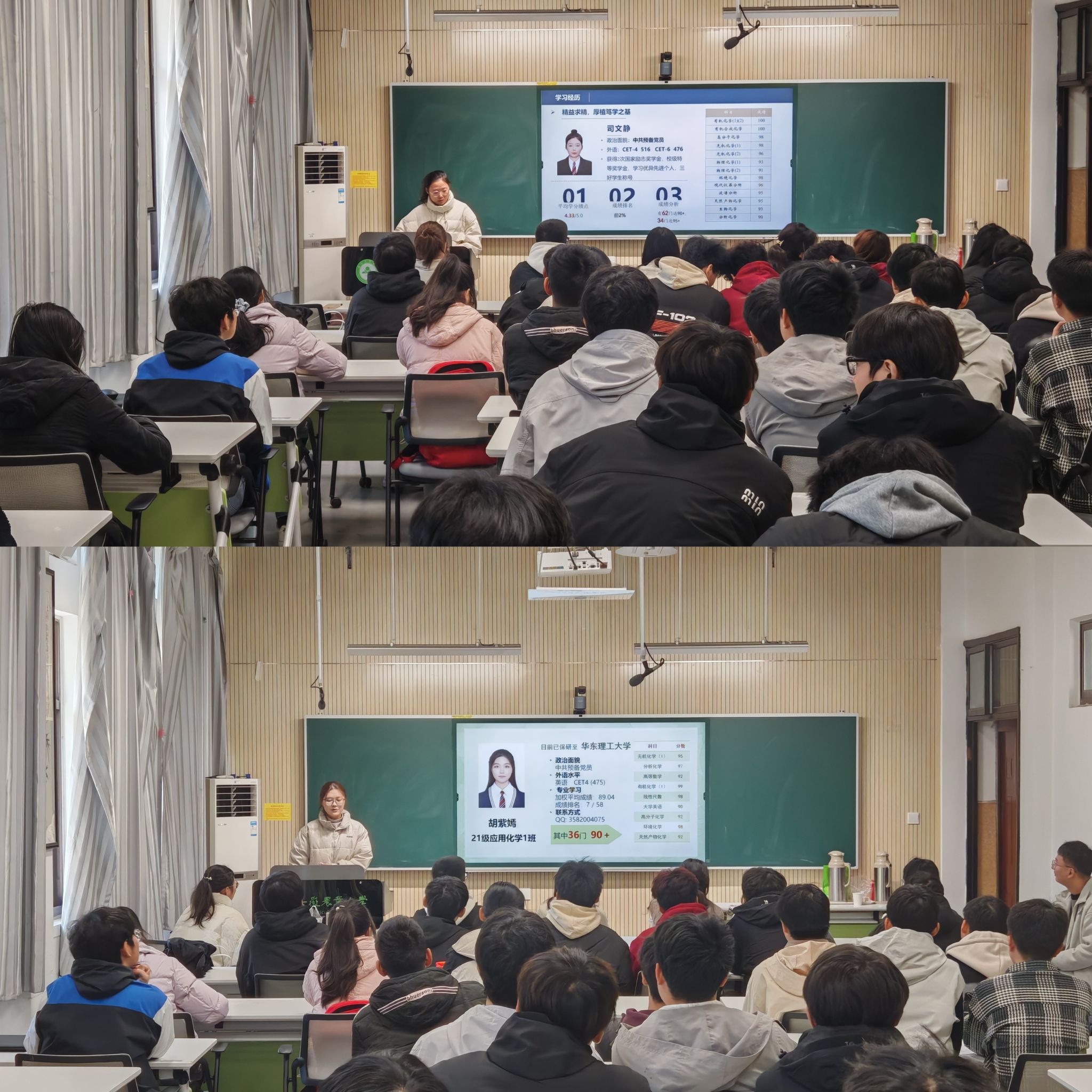 分享会在轻松愉悦的氛围中拉开帷幕,2024年度国家奖学金获得者邢磊,材料科学与工程专业保研学生宫奥、黄鹏、陈玉娇,应用化学专业保研学生司文静、胡紫嫣分享了自己在大学的成长经历,从尽快适应大学生活、制定学习计划、选择高效的学习方法、积极参加各类学科竞赛、提升综合素养和能力、提前规划未来发展等建议和经验为在场的同学指明了方向。