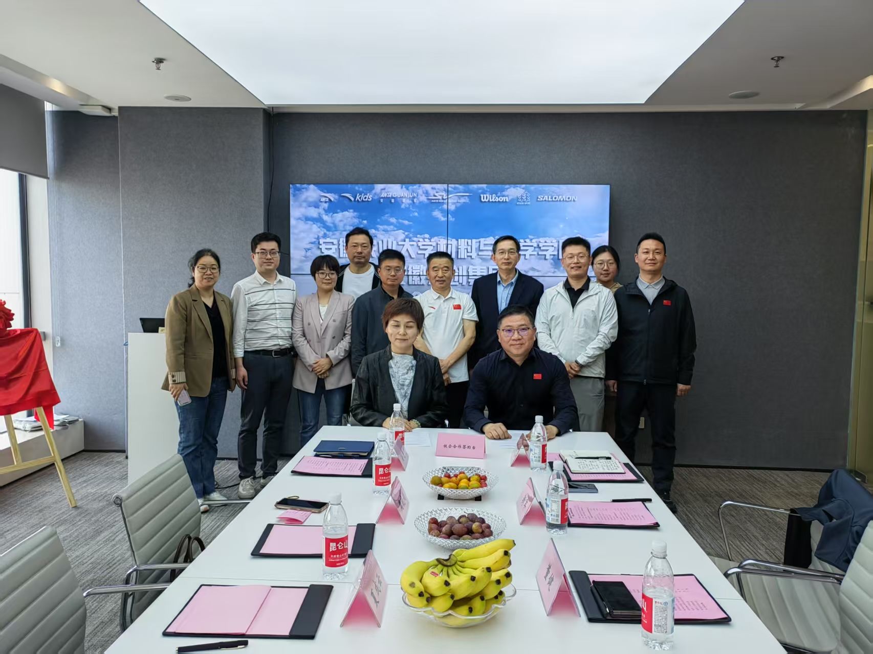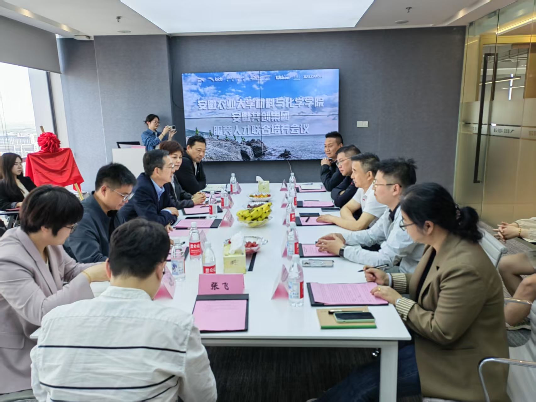 本网讯 4月16日,学院党委书记夏成云、党委副书记、院长汪钟凯一行赴安徽共创集团开展服装人才联合培养签约仪式暨访企拓岗专项行动。安徽共创集团董事长董健、副总经理靳军、新品牌副总经理董鹏、安踏品牌副总经理范中山、人力资源总监郭震,学院党委副书记、纪委书记周晓娟、服装工程系教师参加活动。