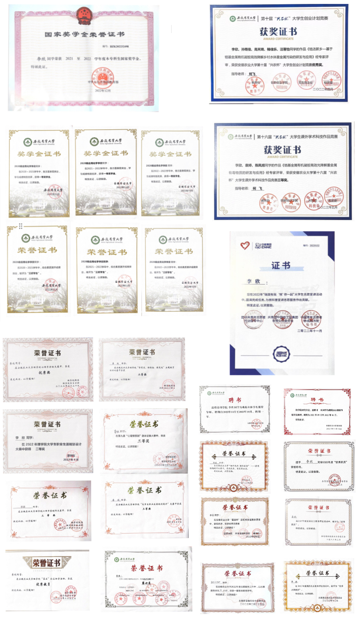 作为安徽农业大学的学子,李欣秉承勤奋、求实、创新的校训,致力于将理论输入转化为实践输出。她积极参加各类比赛,累计获得证书20余张。作为应用化学专业的学生,她结合学科特点与专业优势积极投身于各类科研竞赛中去,她主持一国家级大学生创新创业项目,以第二作者身份发表SCI论文一篇,曾获得安徽省化学竞赛一等奖,全国大学生化学实验创新设计大赛三等奖,安徽农业大学金点子科技创新大赛一等奖,第十届兴农杯大学生创业计划竞赛校级优秀奖,理学院兴农杯大学生创业计划竞赛一等奖,安徽农业大学第十五届“爱农杯”大学生实用技能竞赛三等奖等。
