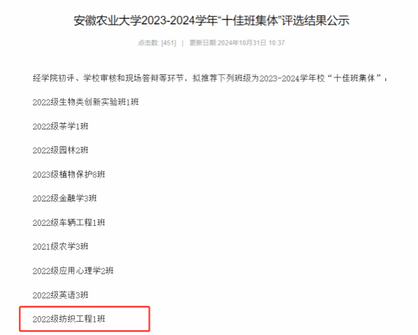 10月30日,2023-2024学年校“十佳班集体”评选答辩会在图书馆第二报告厅举行。校党委组织部、宣传部、教务处、研工部、总务部和保卫处等单位负责人应邀担任评委。各学院学工负责人、答辩班级辅导员和2024级全体班长参加了活动。经班级申报、学院择优推荐、学校审核、答辩展评等环节,我院22级纺织工程1班从全校534个自然班级中脱颖而出,获评2023-2024学年校“十佳班集体”荣誉称号。