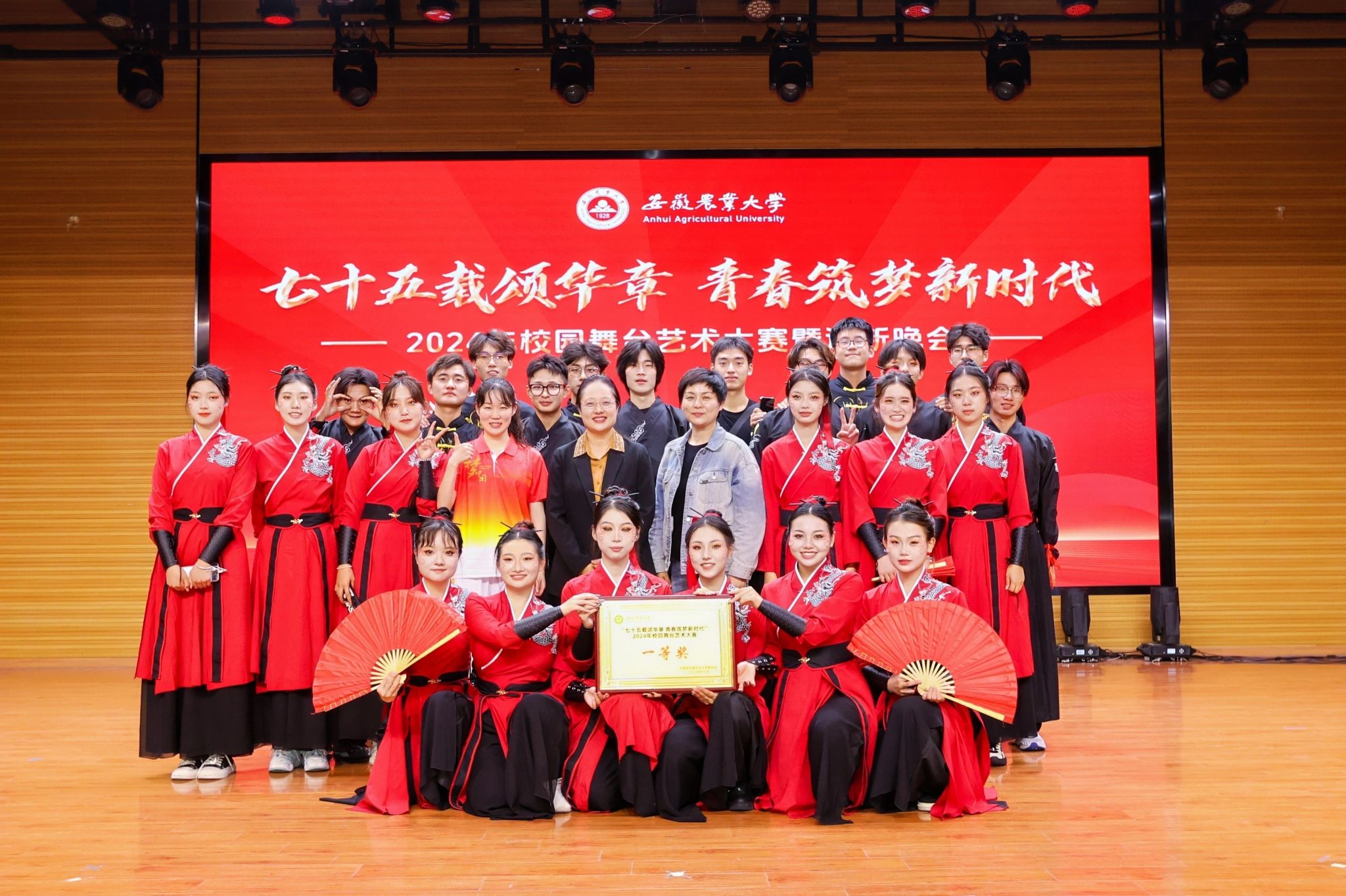 10月28日晚上,“七十五载颂华章 青春筑梦新时代”校园舞台艺术大赛暨迎新晚会在欣苑四楼大学生活动中心举行。校党委常委、副校长李红出席活动,相关职能部门负责同志担任评委。经过激烈的角逐,最终我院《龙腾·华夏》获得一等奖荣誉。
