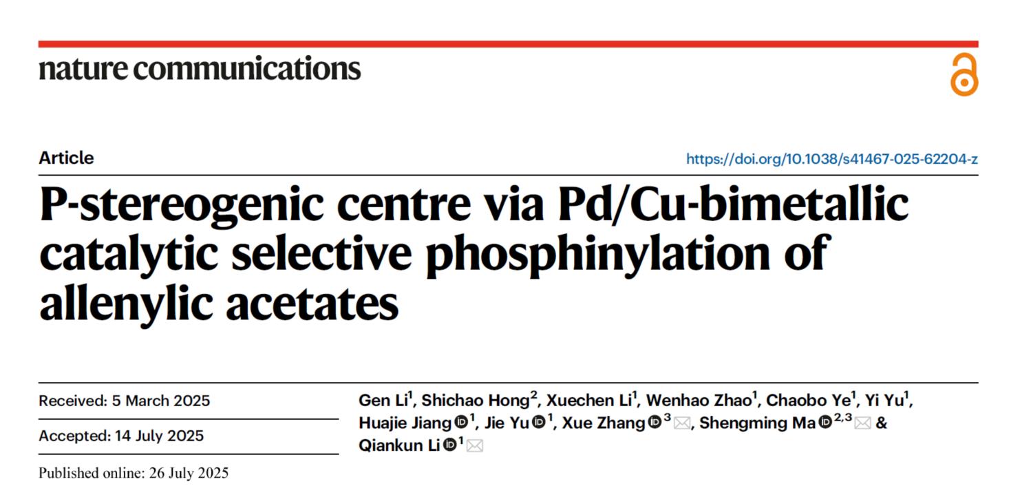 本网讯 近日,我校材料与化学学院手性功能分子合成团队在《自然•通讯》(Nature Communications)发表题为《P-stereogenic centre via Pd/Cu-bimetallic catalytic selective phosphinylation of allenylic acetates》的研究论文。