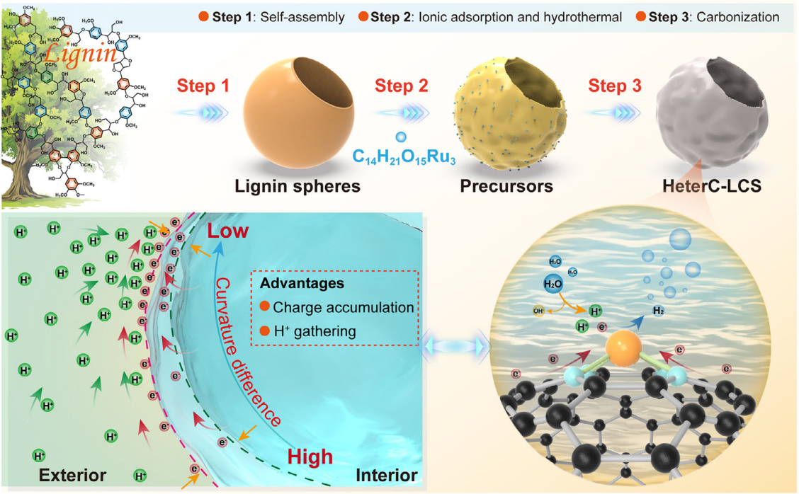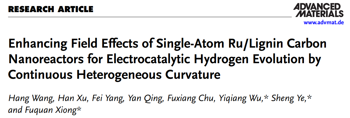 近日,我校材料与化学学院熊福全教授团队在国际材料学顶刊《Advanced Materials》(中科院1区Top,IF=26.8)刊发林木生物质资源高值化利用方面最新研究成果,题为“Enhancing Field Effects of Single-Atom Ru/Lignin Carbon Nanoreactors for Electrocatalytic Hydrogen Evolution by Continuous Heterogeneous Curvature”。