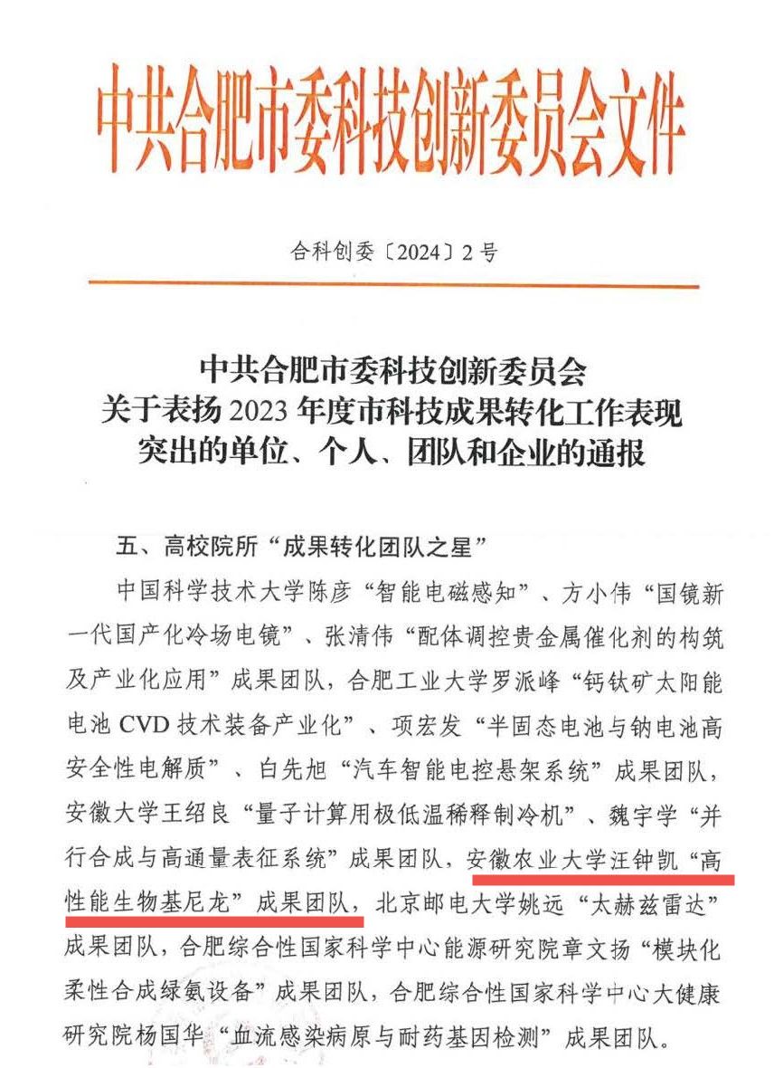 本网讯 近日,材料与化学学院汪钟凯教授带领的“高性能生物基尼龙”团队荣获2023年度合肥市“科技成果转化团队之星”称号。