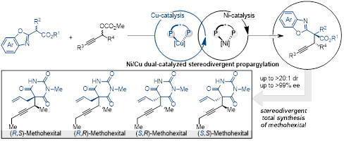 分子的手性在其生物活性中发挥着至关重要的作用。天然产物和药物中通常含有多个邻位立体中心,因此在合成化学领域中,建立这些结构单元的立体选择性具有重要的研究价值。在药物开发过程中,具有多个立体中心的候选分子可能会展现出不同的生物效应,这使得开发高效的立体发散合成方法以获得所有潜在药物候选分子的立体异构体变得尤为重要。Methohexital是一种具有连续手性中心和炔基结构的巴比妥类药物,在牙科领域广泛用作超短效麻醉剂。选择性地获得Methohexital的不同立体异构体有助于研究其立体构型与活性之间的关系,并为微调其药物性能提供新的机会。协同催化在合成多手性复杂分子的过程中,已成为一种重要的方法。这种方法在双中心手性碳-碳键形成过程中,能够同时实现立体选择性的控制,是实现构型多样性的综合策略之一。常西浩教授团队开发了一种以外消旋的炔丙基碳酸酯和苯并噁唑酸酯为起始材料,利用Ni/Cu协同催化的不对称炔丙基化反应。该反应表现出高立体选择性,能够合成一系列具有特殊骨架结构的炔丙基化产物。这一方法已成功应用于生物活性分子Methohexital的立体发散合成中。