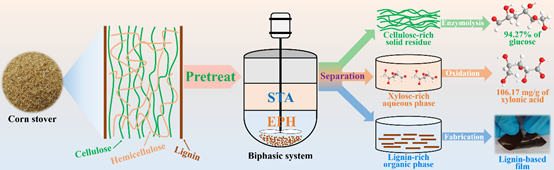 生物质资源作为一种可再生资源,可以转化制备各种燃料、材料和化学品。然而,采用绿色高效的预处理方法分离生物质三大组分,实现生物质资源全组分利用仍然是一大挑战。本研究采用苯氧乙醇/硅钨酸两相溶剂体系预处理玉米秸秆,实现纤维素、半纤维素和木质素高效分离,通过进一步转化利用,富含纤维素的固体残渣的酶解效率高达94.27%,水相中的木糖被氧化生成木糖酸,有机相中的木质素被利用制备高性能木质素薄膜。该研究为实现生物质资源三大组分高效分离及全组分利用提供了新的思路。