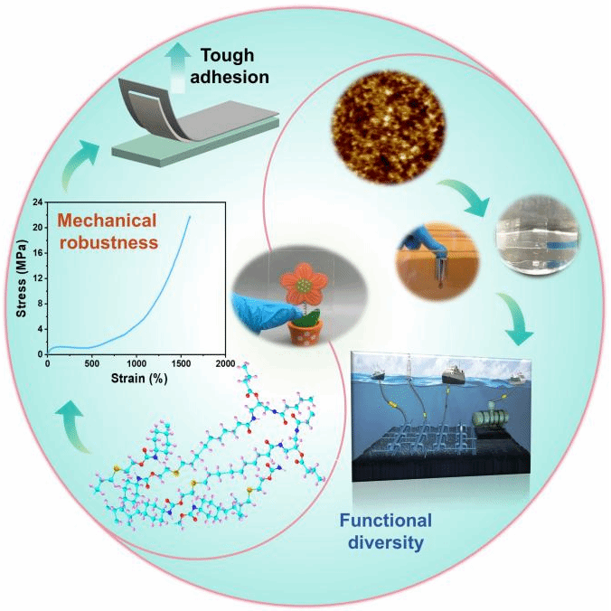 受限于界面水分子对聚合物内部动态相互作用的解离,导致性能和功能性不同程度的下降,成为高性能弹性体材料所面对的严峻挑战之一。基于对弹性体微结构—性能关系的认识,研究团队提出“动态疏水相分离微区”策略,即通过将植物油衍生的脂肪酸长链和动态基元整合到聚合物网络中,实现疏水域和多层级氢键的有效耦合,开发了一种超韧且全环境稳定的自修复聚氨酯-酰胺超分子弹性体。其展现出高拉伸性、极高韧性以及稳健的即时粘附性能,在各种极端水环境下均有出色的自主愈合效能。该工作为开发集成多功能的生物基材料提供了分子设计途径。