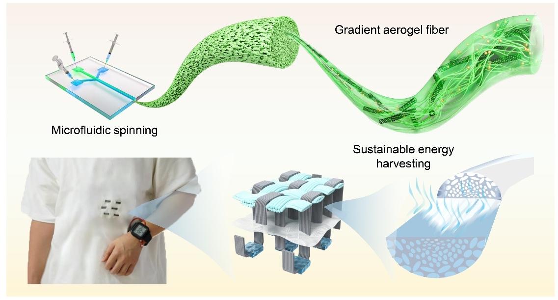 轻量、可持续和可穿戴的能源收集技术为解决传统电力设备呈刚性、体积大等局限提供了创新性的解决思路。叶冬冬教授团队通过引入了一种仿生纳米结构设计,制备了具有高效水传输和蒸发特性的梯度纳米多孔纤维素/CNT气凝胶纤维,用于高效的能量收集,推动了柔性可穿戴电子产品的发展。