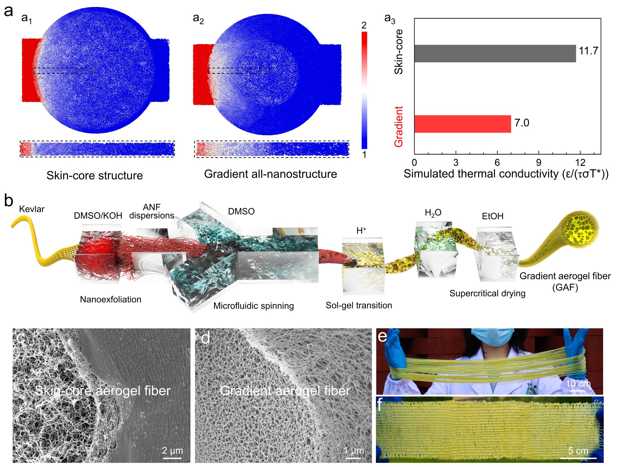 基于以上挑战,叶冬冬教授团队联合西安交通大学宋建伟教授团队与浙江大学朱书泽教授团队,基于微流控纺丝技术精准调控微流道内溶剂剪切与扩散过程,使凝胶纤维形成“外疏内密”的梯度结构,并在超临界干燥过程中反转,最终获得鞘层与芯层平均孔径分别为150 nm与600 nm的梯度纳米结构的气凝胶纤维。这一设计不仅显著提升孔隙率(从98%增至98.6%),还使纤维密度降低至15.7 kg m-³,同时优化了热传递路径与界面热阻。最终制备的梯度全纳米结构芳纶气凝胶纤维(GAFs)在隔热与力学性能上实现重大突破。